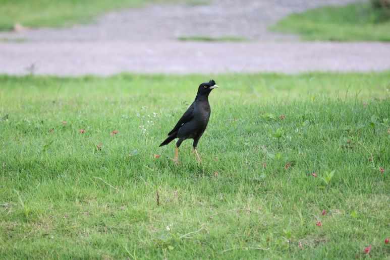 八哥,翅膀上有两块白斑,飞翔时,从下往上看像汉字“八”,因而得名。八哥和乌鸫很像,全身漆黑,明显的差异是八哥有一簇冠毛高耸起来。