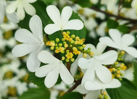 首先来看看蝶花荚蒾(Viburnum hanceanum Maxim.),该种植物和蝴蝶戏珠花(Viburnum plicatum var. tomentosum)同属于忍冬科(现为荚蒾科)荚蒾属,远看很相似,只是蝶花荚蒾的不孕花为2-5朵,叶子有侧脉5-7对;而蝴蝶戏珠花的不孕花为4-6朵,叶子侧脉为10-17对。两种植物开花的时候,都似一只只洁白的蝴蝶停在叶子上休憩,让人忍不住驻足观赏,估计真正的蝴蝶们也会以为是同类,从而相约嬉戏。