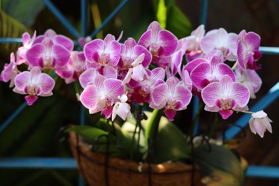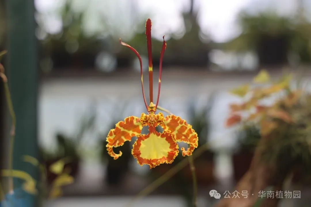 最后就是大名鼎鼎的兰科植物,它们有不少带“蝶”字的种类。其中,最著名的就是广东人新年花市必不可少的蝴蝶兰属(Phalaenopsis)植物。华南国家植物园培育了不少蝴蝶兰新品种,例如:红绒蝴蝶兰,小天使蝴蝶火焰兰、白蝴蝶等。我们还保育了原产于南美洲和中美洲的拟蝶唇兰属(Psychopsis)植物——拟蝶唇兰(Psychopsis papilio (Lindl.) H. G. Jones)以及拟蝶唇兰的栽培品种黄花魔鬼文心兰(Psychopsis papilio 'Alba')。该属为附生兰,原属于文心兰属(Oncidium),现单列为一个属,国内称为“魔鬼文心兰”,是比较稀有、特异的热带兰花,具有较高的观赏价值。 魔鬼文心兰花期约15-20天;花谢后,间隔几周花序顶端又产生新的花芽,几乎常年开花。