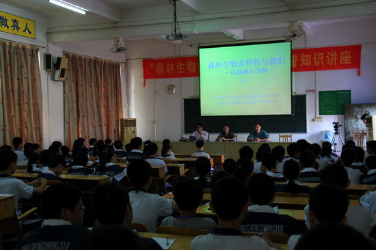 一堂生动的《森林生物多样性与我们》科普知识讲座拉开活动的序幕。黄忠良以鼎湖山森林为例,通过多彩的森林景观、丰富的物种资源图片,循序渐进,从多个层次全面介绍森林生物多样性的含义及其与人类密不可分的联系,号召学生们行动起来保护森林、保护生物多样性。