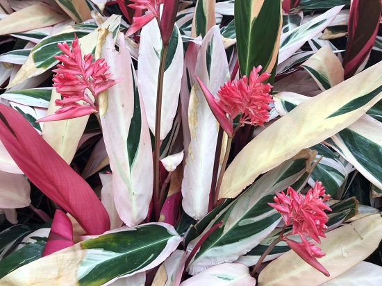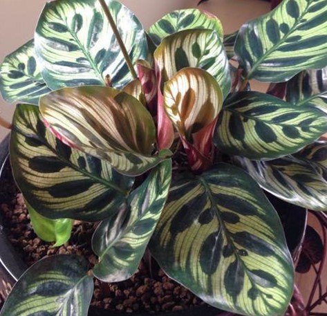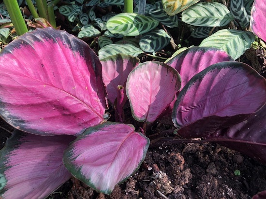 三色花竹芋,一听名字就知道叶子颜色多样,正面有淡绿色、白色至淡粉红色斑,背面淡紫红色,整个植株富有变化感。