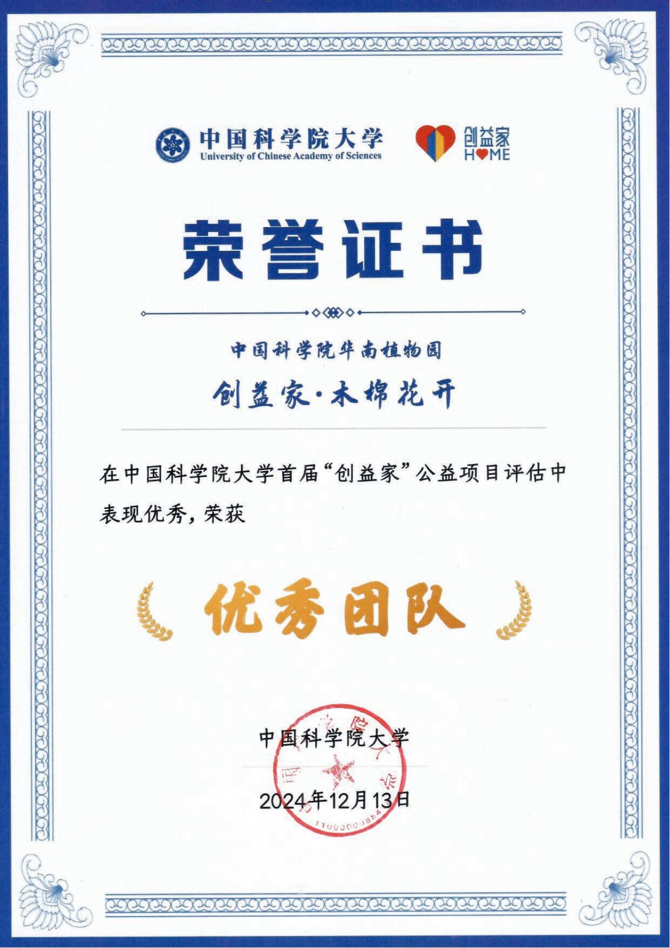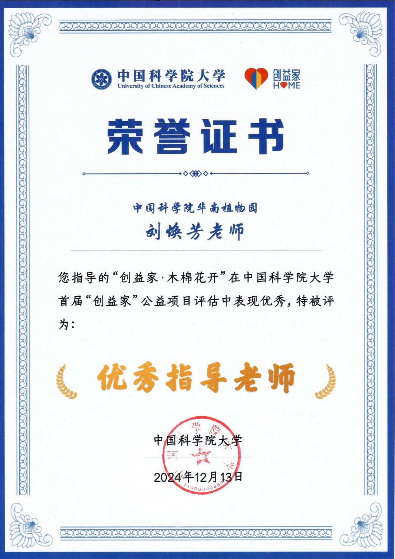 近日,中国科学院大学首届“创益家”项目颁奖仪式在北京举行。国科大基金会、学生处、团委组织专家根据原创性、公益性、创新性、可持续性和传播性等评审原则,对59个公益团队进行评审,共评选出10支优秀团队,9名优秀指导教师。中国科学院华南植物园“木棉花开”科普项目获评优秀“创益家”团队,刘焕芳获评“优秀指导老师”荣誉称号。