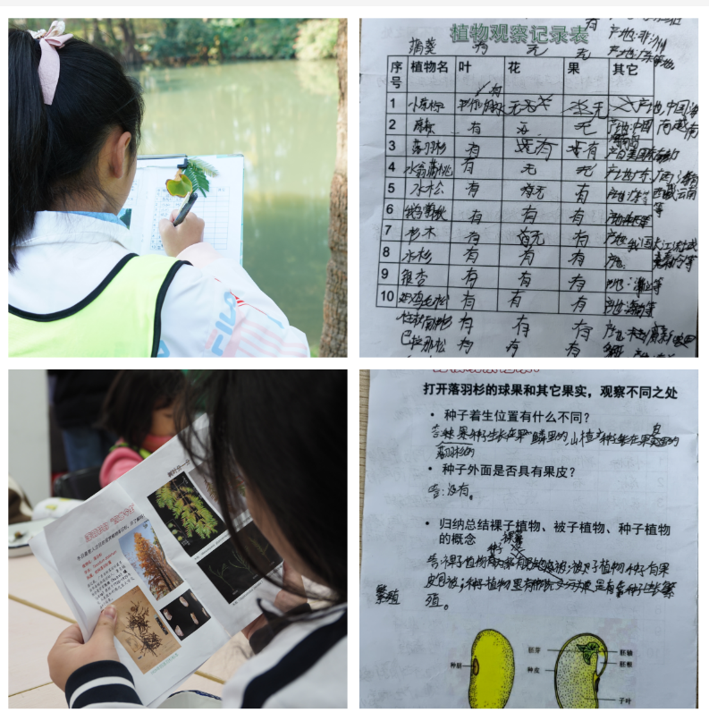 落羽杉林被称作“水上森林”,它在水中不会倒,有什么秘诀呢?人们常常将落羽杉错认作水杉,水杉和落羽杉有什么区别?为什么水松会被列为国家一级重点保护植物?同学们带着一系列的疑问在孑遗植物区仔细观察,认真探究,在自然中寻找答案。