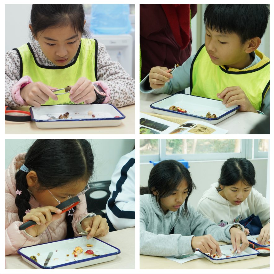 落羽杉是裸子植物,没有真正意义上的花。从果实的外表上我们很难分辨裸子植物和被子植物,双子叶植物和单子叶植物等,那么就通过解剖来一探究竟吧!活动以落羽杉球果、山楂、花生等作为实验对象,同学们拿起镊子、解剖刀、培养皿等工具,学习如何正确解剖果实,通过对比直观感受不同植物的不同特征,种子的着生位置有什么不同?种子外面是否具有果皮?同时启发他们对植物传粉方式、种子传播方式的思考。 “哇”课堂上同学们时不时发出惊叹声,他们对植物有了更多的发现,纷纷踊跃发言。