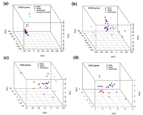 图1:中国荠菜的地理分布和遗传结构。(a)地理分布,圆形表示荠菜,蓝色、红色和绿色分别代表来自东部、西部和西北的荠菜,黄色三角形表示Capsella orientalis居群;(b)STRUCTURE分析推断分为2组:西北地区和其它地区;(c)主成分聚类分析推断分为三组:西北、西部和东部;(d)最大似然法建树分组与主成分聚类分析基本一致。