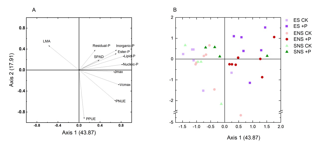 图2. 通过主成分分析对外来物种 (ES)、广布本地物种 (ENS) 和狭布本地物种 (SNS) 的基于叶片形状和叶片磷组分的子在缺磷(CK)和富磷(+P)环境下分布差异
