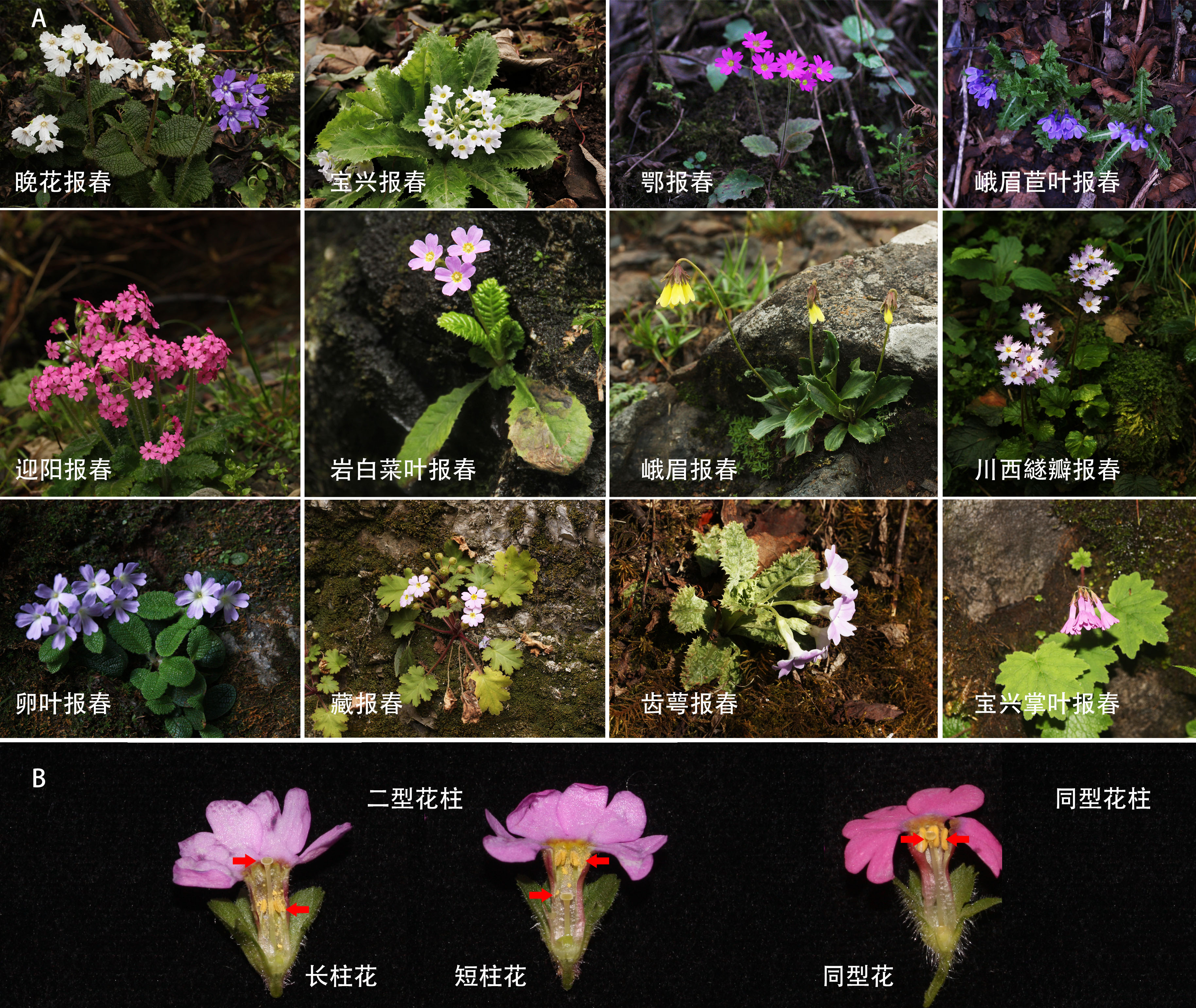 图1. 报春花属物种及其二型花柱特性。A 西南地区代表山地峨眉山广泛分布的12种报春花属物种;B 迎阳报春的花结构特征,分别展示长柱花,短柱花以及同型花。红色箭头分别指示柱头和花药