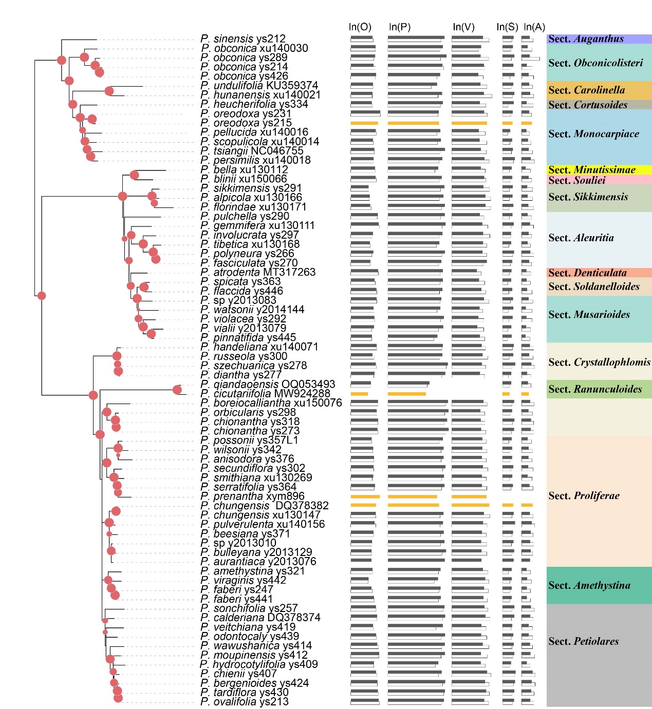 图2. 基于三个叶绿体片段的报春花属物种系统发育树。右侧展示的条形图分别代表配子数目及花性状数据。