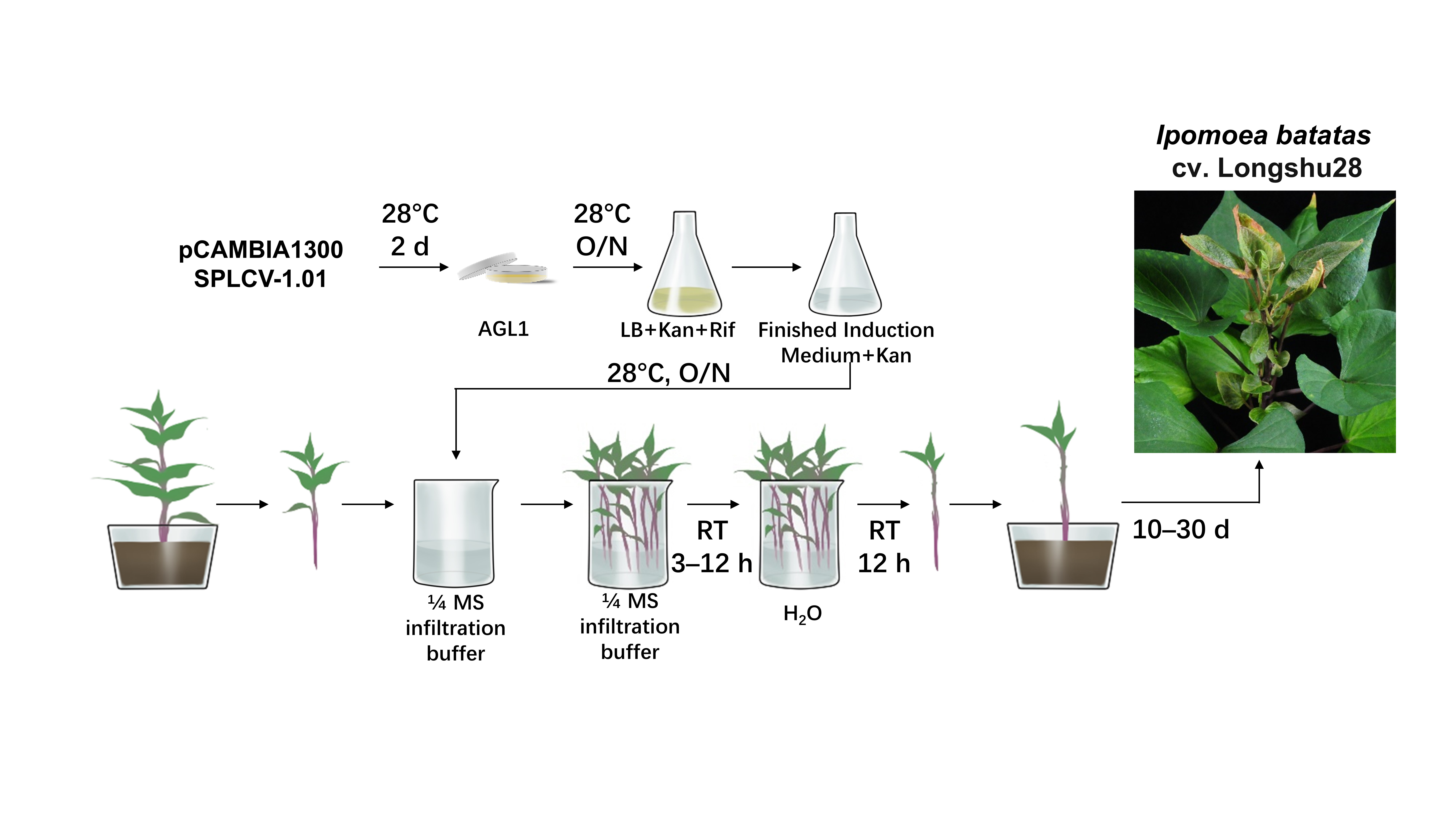 双生病毒科是病毒界中最大的一个科。双生病毒通常含有一个或两个单链环状DNA,分别称为单组分双生病毒和双组分双生病毒,单组分双生病毒通常还伴随一个卫星DNA。甘薯曲叶病毒是单组分双生病毒,是危害甘薯产业最严重的DNA病毒。邓书林团队今年上半年发表文章,建立了简便高效的甘薯曲叶病毒侵染体系,并利用SBG51卫星DNA设计了病毒诱导的基因沉默(VIGS)系统(Zhang Yi,et. al, Phytopathology Research 2024)(图1),该体系为甘薯抗病育种以及功能基因研究奠定了基础。