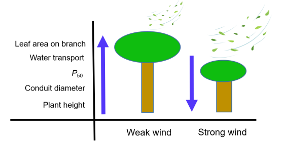 图1. 不同风速条件下植物性状的变化。强风降低了林冠和植物的边界层阻力,导致植物表面变干,并受到机械损伤。在此条件下,强抗旱性、枝条上较少的叶片和强机械抗性对植物是有利的。与此相反,在低风速条件下,植物受到的干旱胁迫、机械损伤较低,植物木质部导水更快,长的更高。