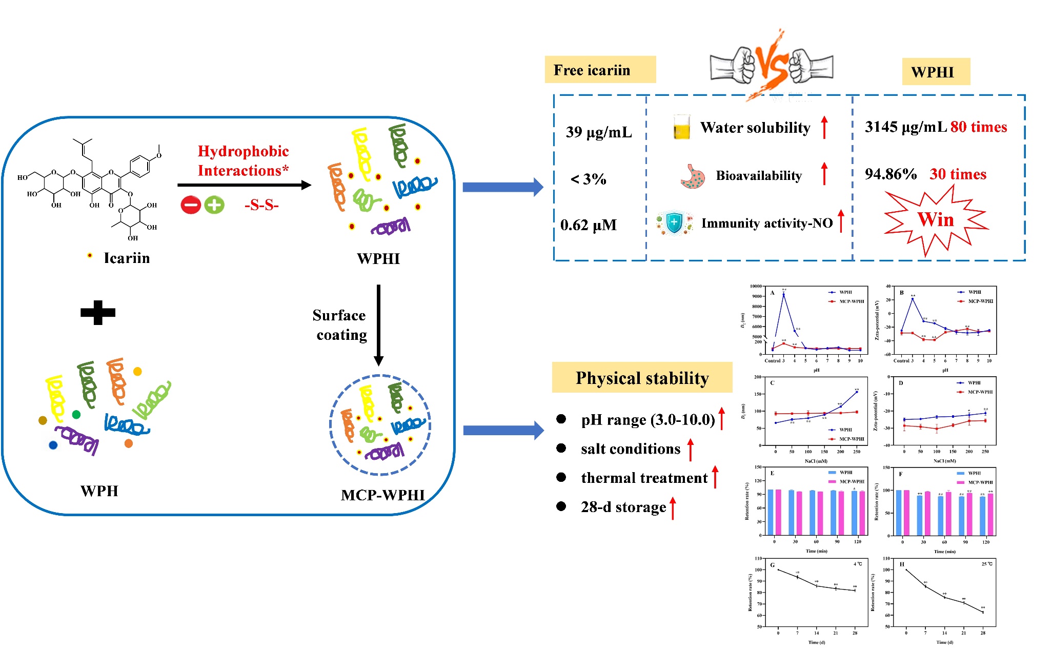 图. 核桃蛋白水解物-淫羊藿苷纳米粒子(WPHI)的复合作用及其三元纳米复合物(MCP-WPHI)的稳定性分析。