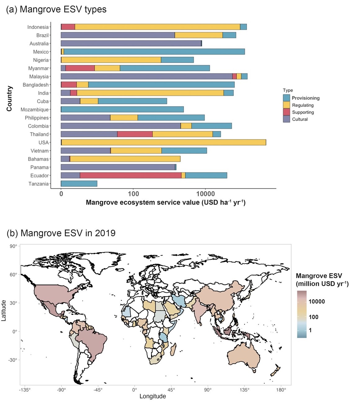 图1. 红树林提供的不同类别的生态系统服务价值。