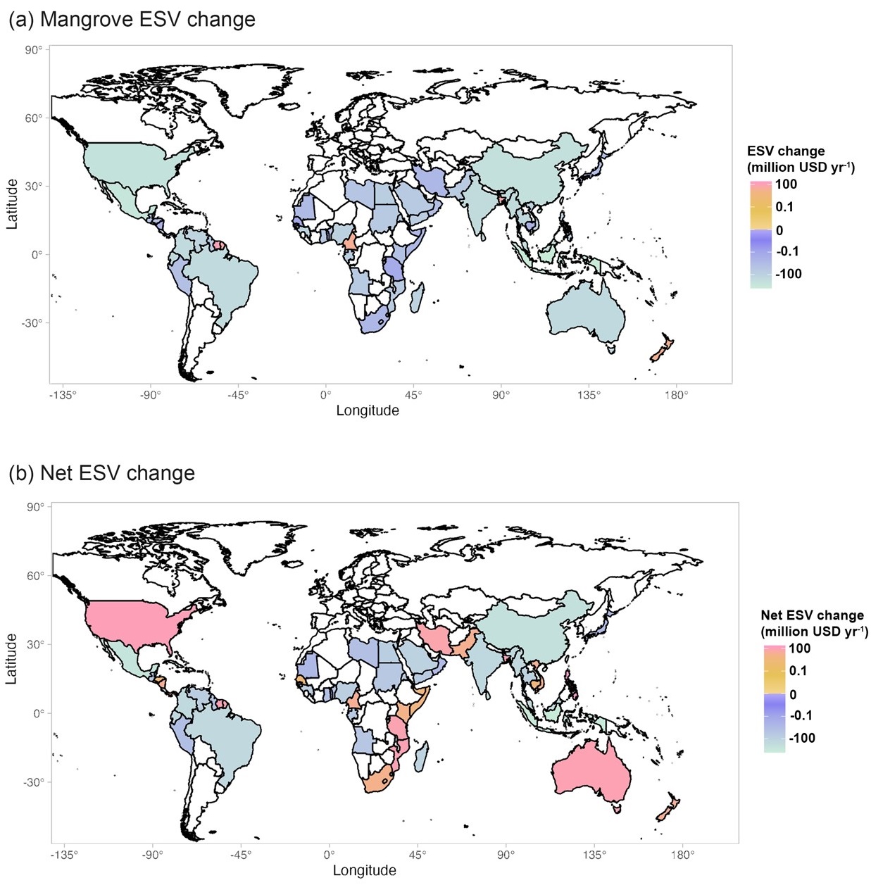图2. 全球红树林的生态系统服务价值变化。