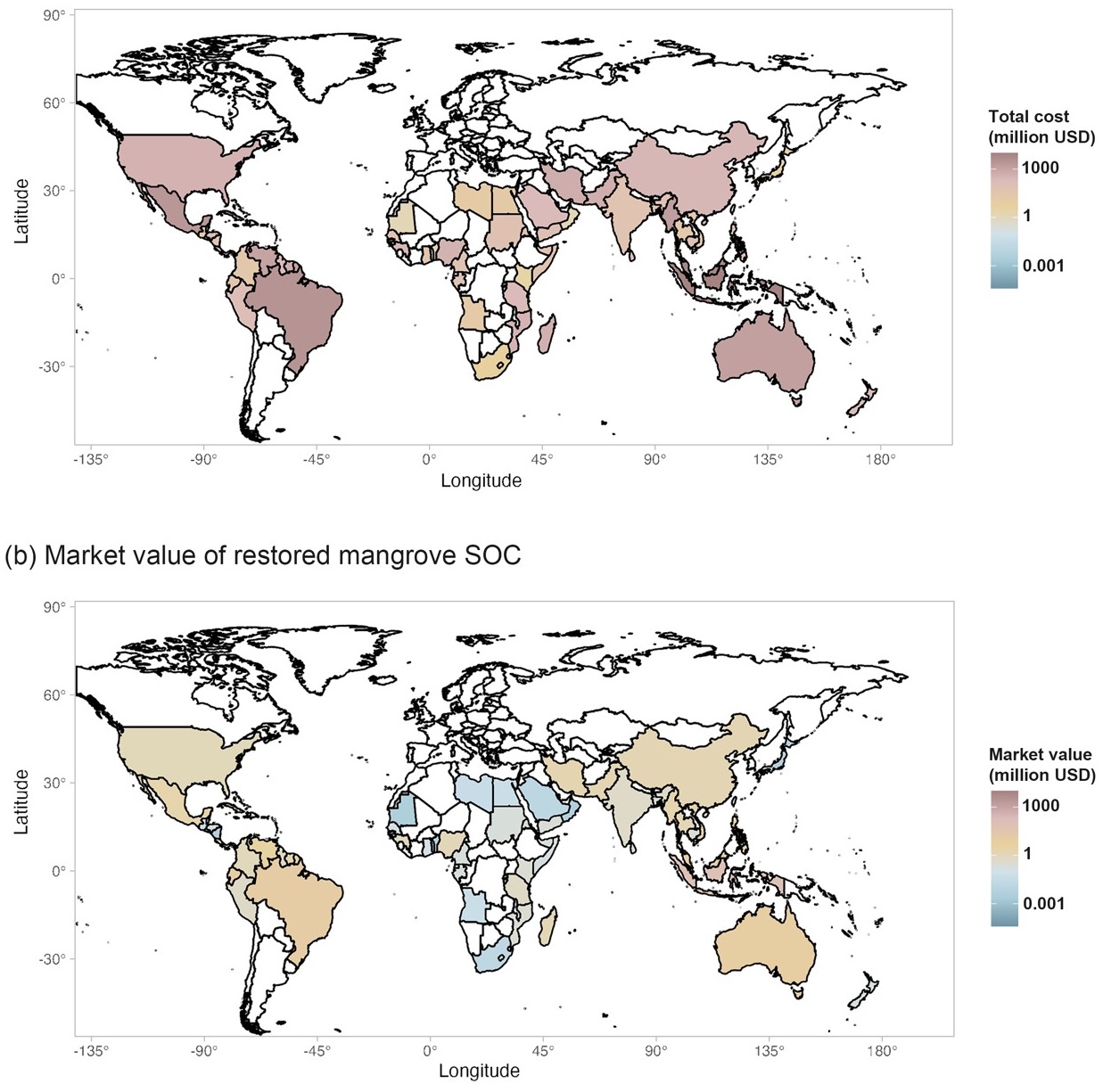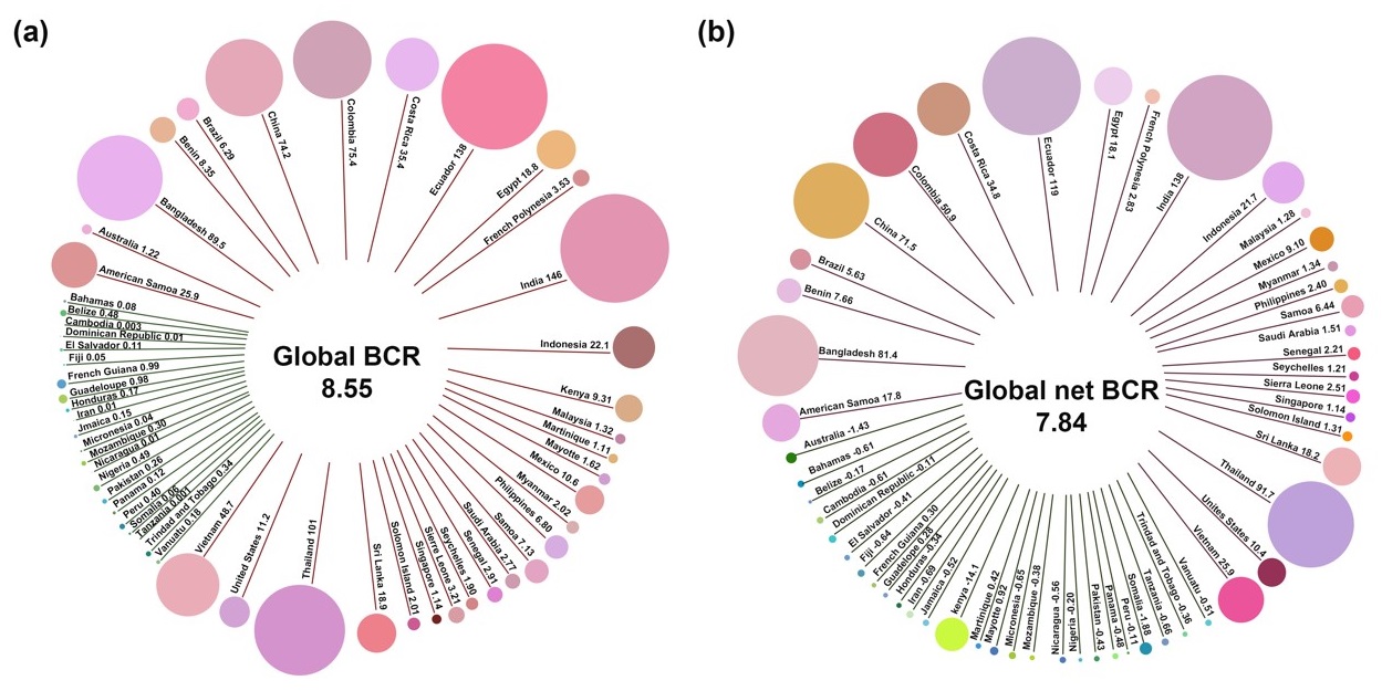 图4. 国家尺度的红树林恢复的收益投资比。