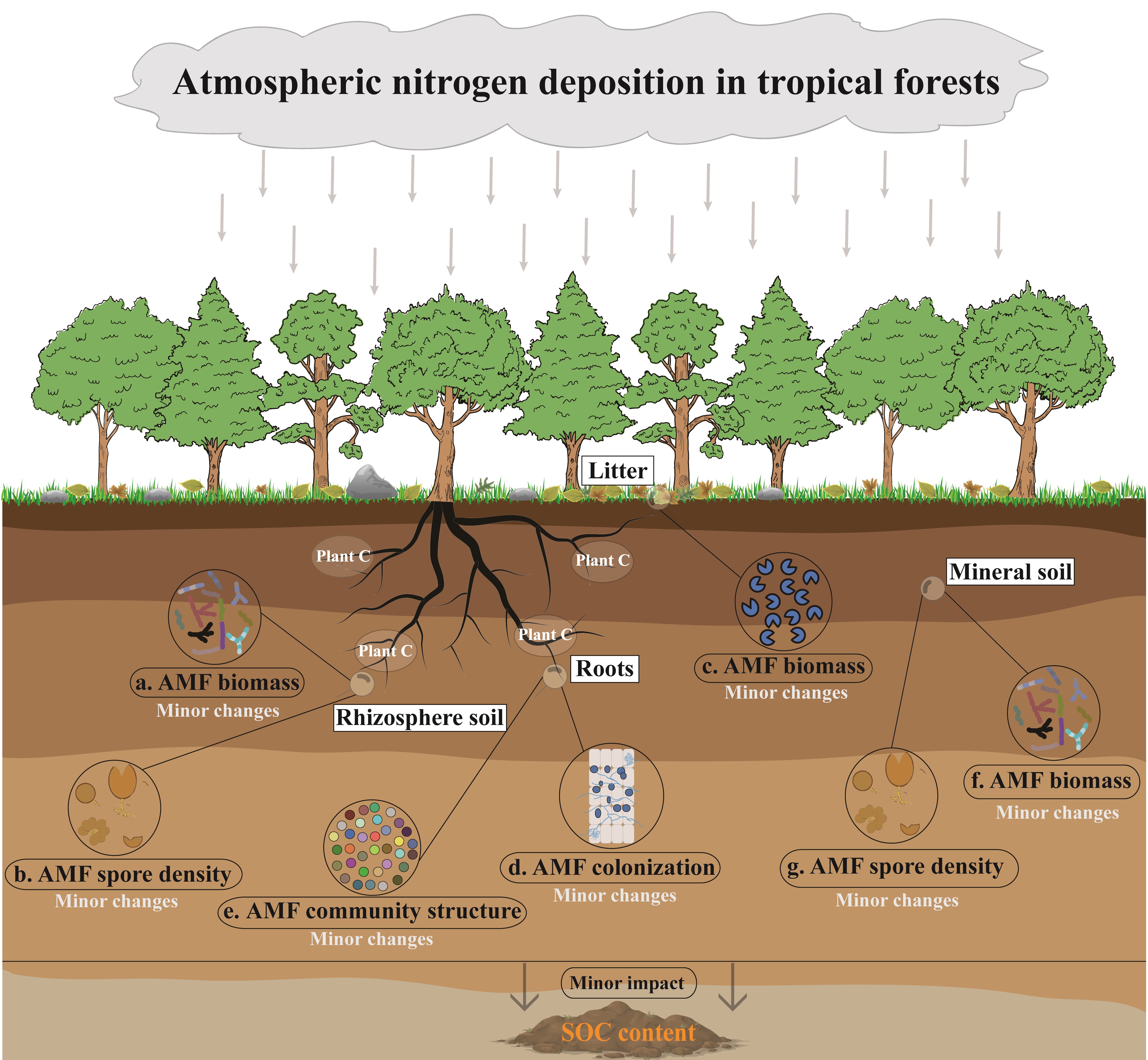 图1. 大气氮沉降对热带森林AMF丰度和多样性及土壤有机碳储量影响的概念图