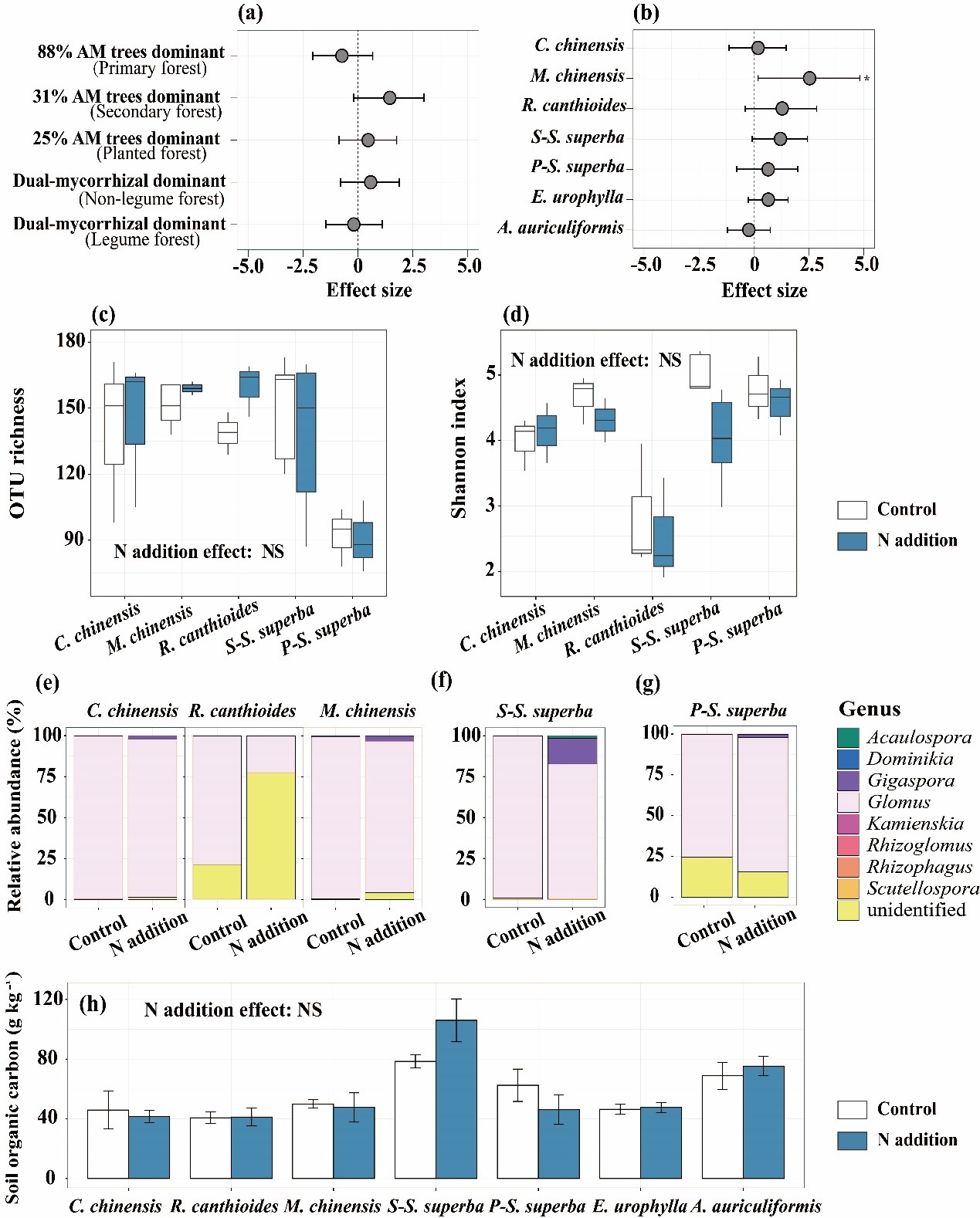 图2. 氮添加对鼎湖山和鹤山森林AMF丰度和多样性以及土壤有机碳的影响