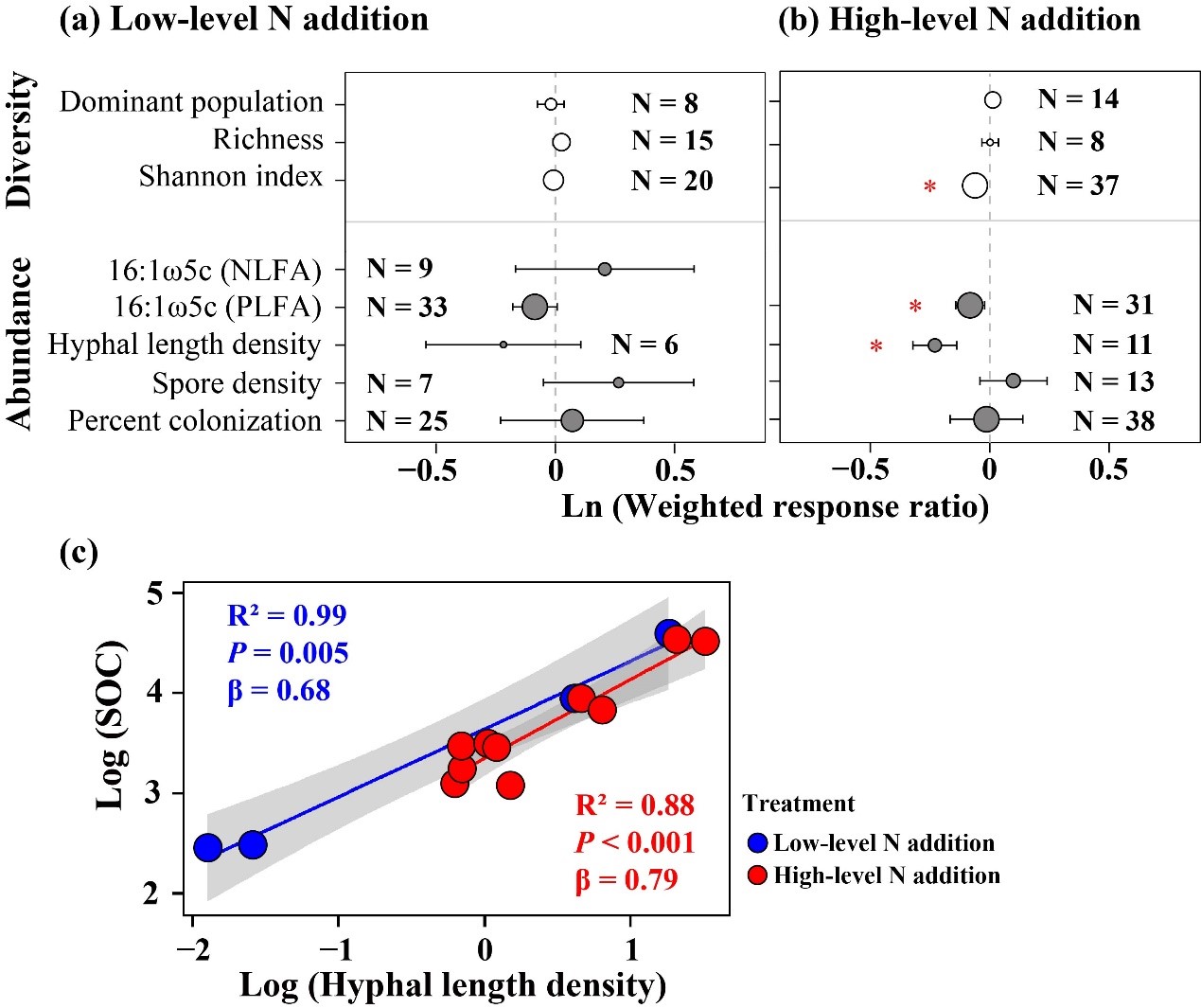 图3. 低氮添加(a)和高氮添加(b)对热带森林AMF多样性和丰度的影响,以及两种氮添加水平下土壤AMF菌丝长度密度与土壤有机碳之间的关系