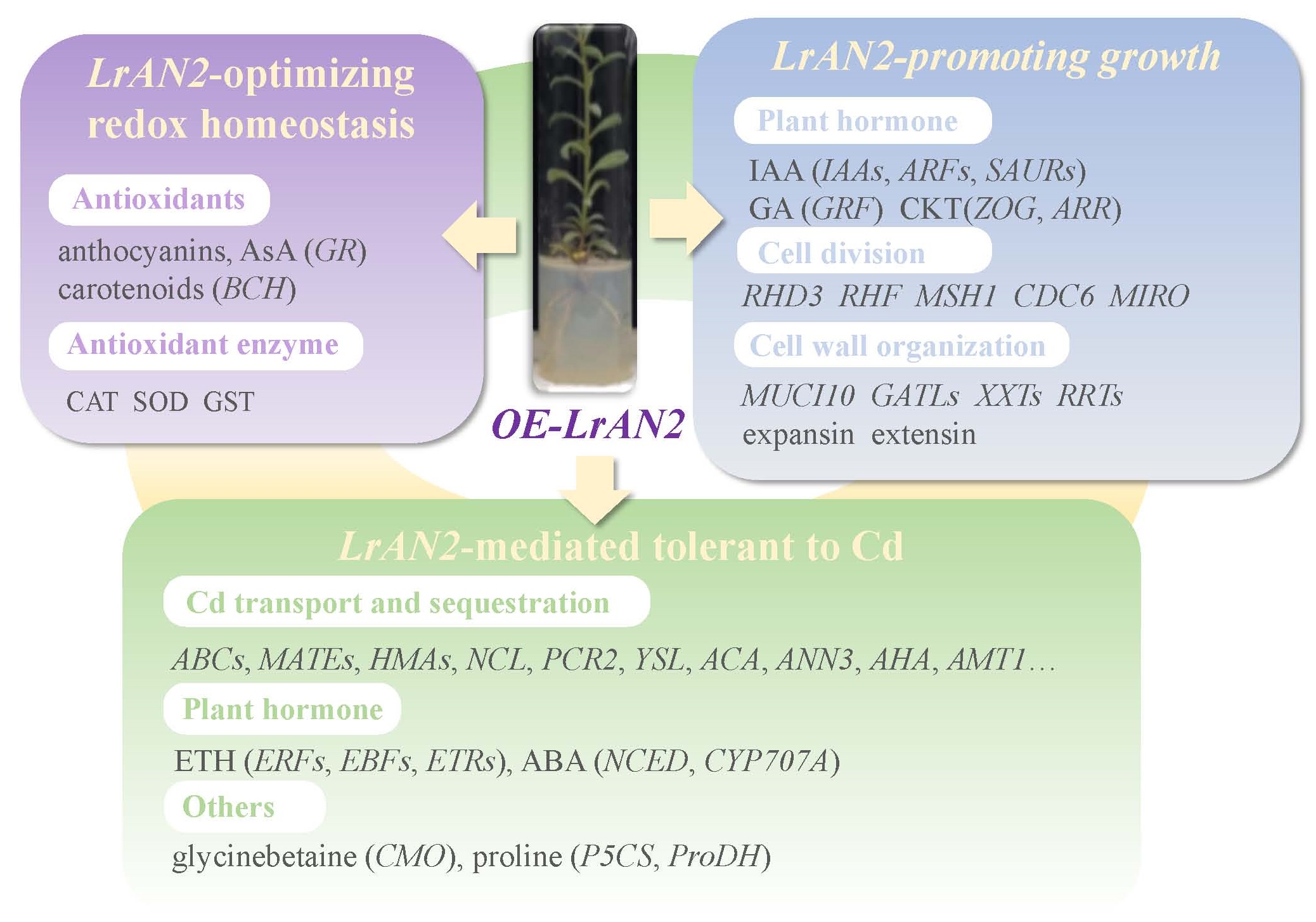 中国科学院华南植物园科研人员通过对经0、25、50、100 μM CdCl2处理30天的OE-LrAN2幼苗进行转录组分析,利用加权基因共表达网络分析(WGCNA)构建了LrAN2介导的调控网络,预测了黑果枸杞耐镉胁迫的潜在关键基因。并通过染色质免疫沉淀测序分析表明,LrAN2的下游靶基因涉及花青素、甘氨酸甜菜碱和脯氨酸的生物合成,生长素、乙烯和细胞分裂素等植物激素信号通路,以及重金属阳离子转运ATP酶、MATE和ABC转运蛋白等溶质运输系统。双荧光素酶报告基因检测证实,LrAN2可激活类胡萝卜素合成基因(LrBCH)、MATE型花青素转运蛋白基因(LrTT12)和生长素响应蛋白家族基因(LrSAUR72)的表达。通过酵母体内功能验证,发现LrAN2的靶基因LrTT12TT12Lru03G01504)能够将Cd隔离至液泡,从而实现Cd解毒。综上所述,LrAN2通过多维度调控策略增强黑果枸杞对镉胁迫的耐受性,为长期困扰的镉污染治理开辟新途径。本研究鉴定的LrAN2靶基因群为作物耐镉遗传改良提供了宝贵的基因资源。