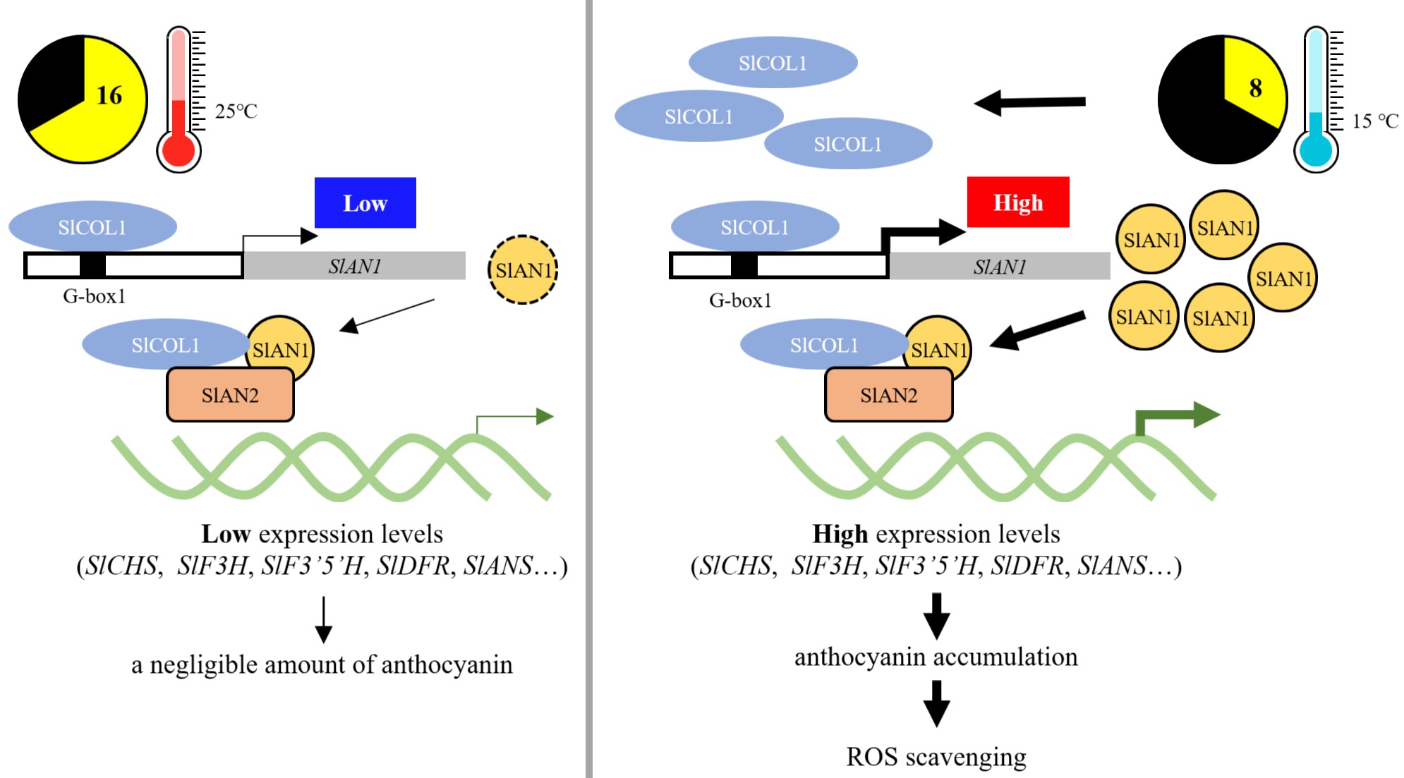 中国科学院华南植物园邓书林科研团队发现,番茄CONSTANS-Like 1SlCOL1)作为CO的同源基因,SlCOL1不影响番茄在长日照(LD)和短日照(SD)下的开花时间。观察表型发现,在SD下显著诱导番茄叶片中花青素的积累,但Slcol1突变体叶片中花青素的含量显著低于野生型。并通过Dual-LUC、Y1H、EMSA和ChIP-qPCR实验验证SlCOL1能够直接结合调控花青素生物合成MBW复合体中的关键基因Hoffman’s Anthocyanin 1SlAN1)的启动子G-box1元件并激活其表达。同时,实验证明SlCOL1可以与SlAN1相互作用,促进SD下花青素合成结构基因的表达,进而促进花青素的生物合成。短日照环境常常伴随着亚适低温环境,例如北半球秋季。在短日照亚适低温(15℃)环境能够诱导SlCOL1表达水平上调进一步促进花青素的积累,积累的花青素有助于番茄清除活性氧(ROS),以适应秋季环境。