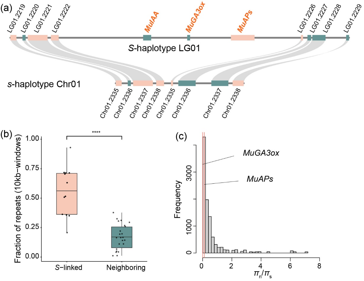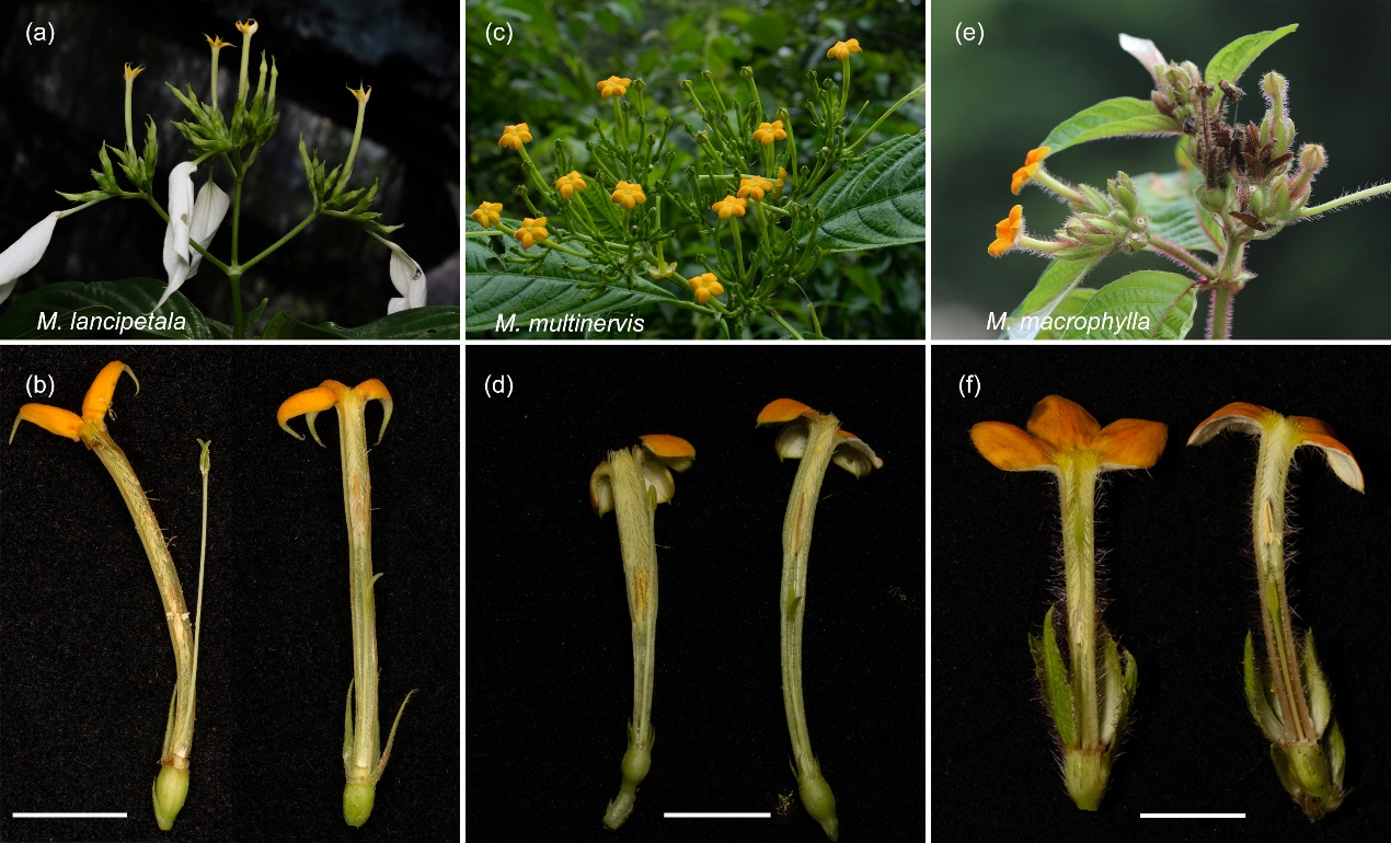 中国科学院华南植物园罗世孝研究团队以茜草科玉叶金花属(Mussaenda)为研究对象,结合基因组从头组装、比较基因组、群体基因组、转录组和系统发育等手段,鉴定了控制玉叶金花属异型花柱发育的超基因(S-locus supergene)的结构及其起源演化规律。研究发现(1)控制玉叶金花属异型花柱发育的超基因由3个紧密连锁的基因(MuIAA, MuGA3ox, MuAPs)组成,且只存在于短柱花个体中,呈半合子结构;(2)由于半合子结构导致的重组抑制,S-locus 所在基因组区域比其两侧区域富集显著高比例的重复序列;(3)S-locus 超基因是通过基因的逐步复制并且插入到该区域所形成的, 其中MuIAA 的复制出现在茜草科分化之前,而MuGA3ox 则出现在茜草科物种分化之后;(4)超基因中名为MuIAA的生长素响应基因在短花柱的雌蕊和花筒部位高度活跃,是调控花柱长短的候选基因。该研究不仅证实异型花柱演化在分子上存在趋同机制(S-locus 的普遍半合子结构),更首次揭示生长素相关基因在调控花柱长短的核心作用。未来进一步的科学问题包括为什么某些植物类群更易演化出异型花柱?激素代谢通路如何影响这类精巧结构的存续?这些发现将为解析植物多样性起源打开新窗口。
