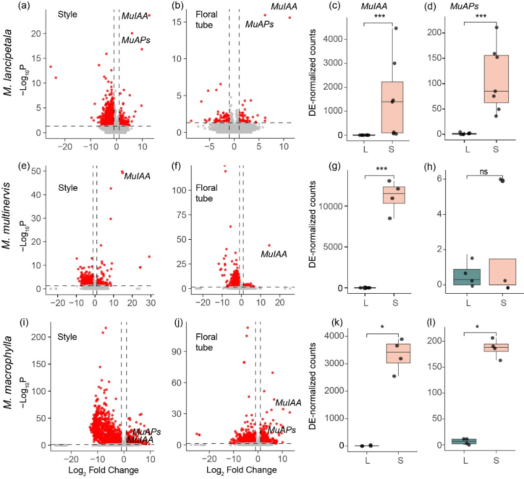 图3. 玉叶金花属长柱花和短柱花的花柱和花冠管的差异表达基因。S-locus 基因MuIAA 和MuAPs 在短柱花中显著高表达。