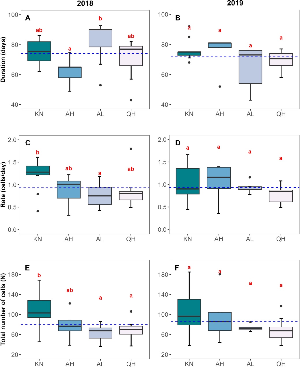 图. 木质部细胞生长季、生长速度和细胞量在样方和年际间的差异