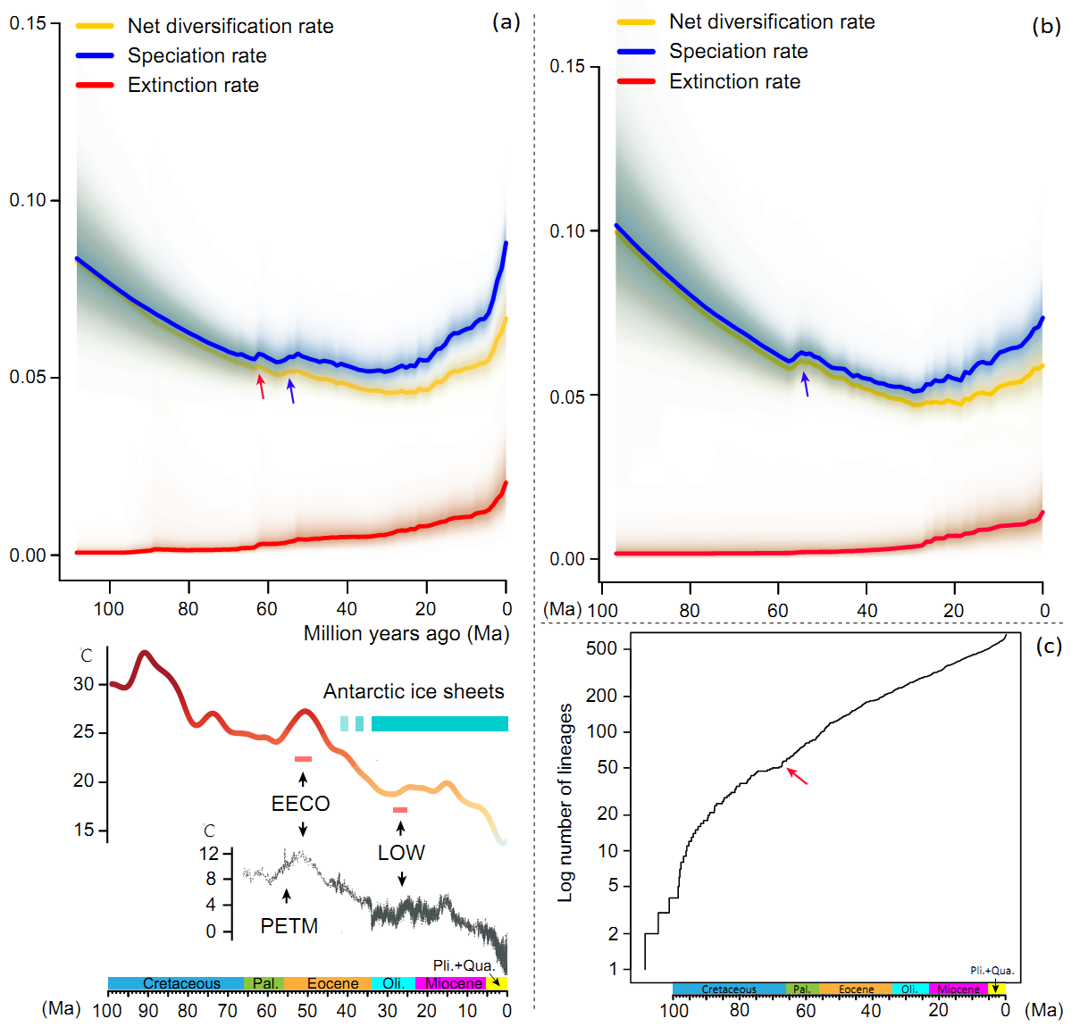 热带雨林是当今地球陆地生态系统中起源最为古老的生物群系,可能在白垩纪中期已开始出现。相比于其他生物群系, 热带雨林拥有全球最高的年均降水量和平均气温,在其分布区仅占全球不足7%的陆地面积基础上孕育了全球近半数生物物种,是全球陆地生态系统中物种多样性与生产量最高的生物群系,在调节全球气候与维持生态平衡方面发挥着巨大作用。尽管全球气候变化事件在很大程度上影响了众多生物群系的演化历史已是学界共识,但目前关于“古气候变化事件是否影响了热带雨林的动态演化历史过程”这一问题还颇具争议。部分研究认为古气候变化事件对热带雨林的动态演化历史影响非常有限,热带雨林可能长期保持相对较为稳定的高温、高湿环境条件,致使其物种分化速率长期趋于恒定状态,其物种多样性随时间持续且稳定的积累,这一过程亦被视为热带雨林物种多样化的重要演化模式。然而,另有研究则认为热带雨林的物种多样化历程可能受到了全球气候变化事件的影响,其物种分化速率在不同时期可能存在明显波动而非长期趋于恒定,但相关研究大多关注于热带雨林类群在新生代时期的演化历史。