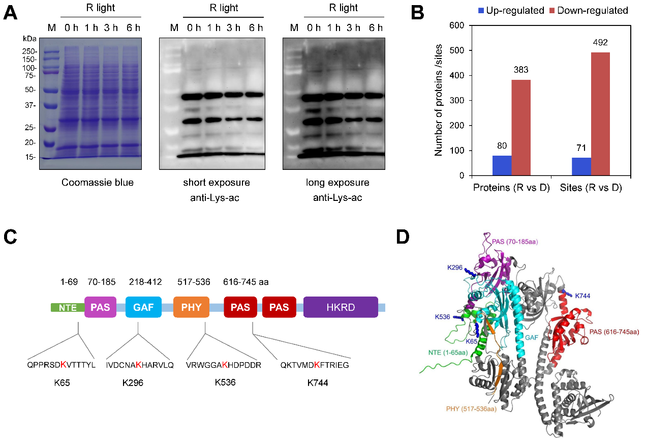 研究团队通过Western blot实验发现,幼苗从黑暗转入光照后,整体乙酰化水平显著下降。进一步利用乙酰化组学技术系统鉴定该过程中发生修饰变化的蛋白及位点,发现光诱导了大量的蛋白和位点发生去乙酰化。phyA蛋白上存在4个保守的赖氨酸乙酰化修饰位点(K65,K296,K536和K744),其中K65和K744位点发生显著的去乙酰化(图1)。
