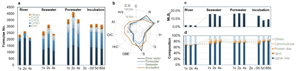 为此,我们采集了典型端元水体(表层、深层海水,滨海红树林沉积物间隙水、内陆湿地间隙水,以及河水样品)进行方法调试和验证。基于当前常用的7T 、9.4T和12T FT-ICR MS设备,本研究比较了多种分辨率调整策略。这三种磁场强度代表了目前较为普及的仪器类型,研究结果可为使用不同仪器的研究人员提供优化思路,也有助于推动DOM研究方法的标准化和数据共享。结果表明,根据不同水体来源的特征差异和研究目标,相应的DOM信号调试策略也不同(图1)。该研究不仅有效提升了溶解有机质的信号(图2)、增强了不同水体端元(河流、间隙水、海水)指纹图谱的差异化特征,也提出了在不同分辨率条件下具有可信度的变异系数区间(图3),从而提升了不同实验室之间信号的可比性。