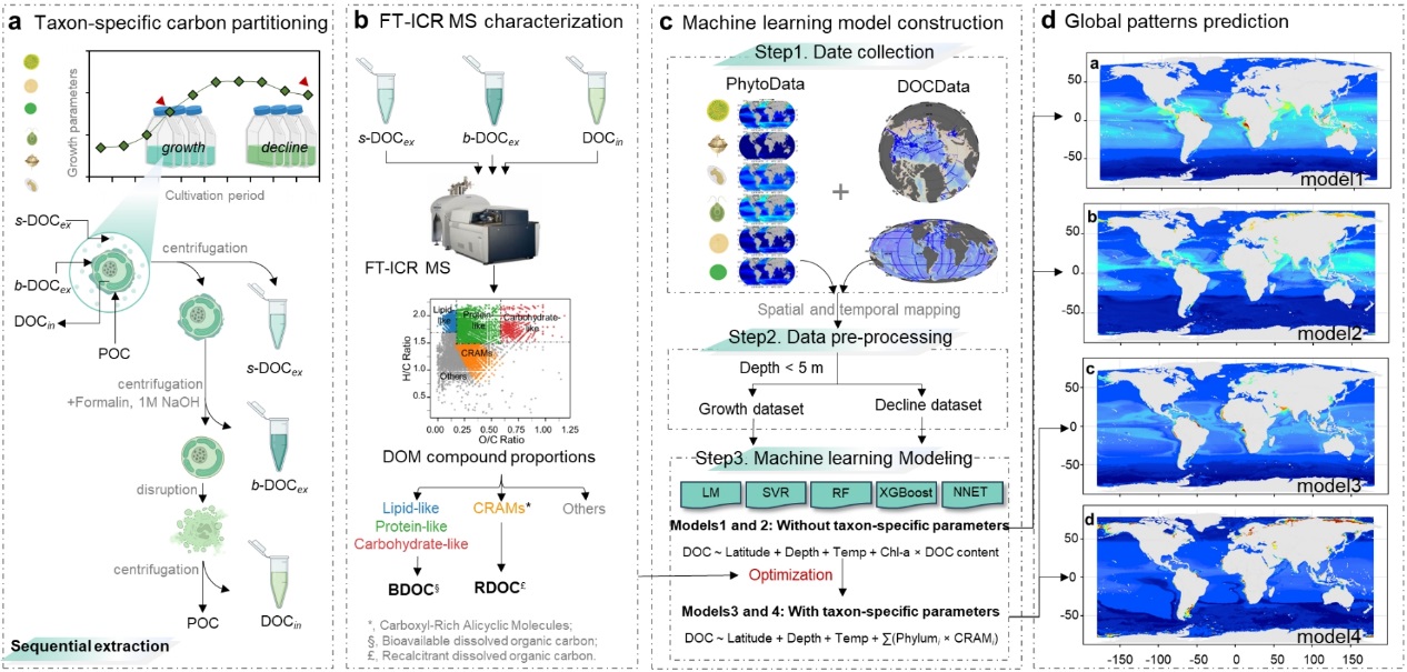 浮游植物(藻)是海洋溶解性有机碳(DOC)的主要来源,它们产生的DOC一方面以生物可利用有机碳(BDOC)的形式被微生物快速消耗,并在转化过程中部分进入顽固碳(RDOC)库;另一方面也可直接分泌RDOC。无论是间接转化还是直接分泌,这些 RDOC 最终都会对海洋 DOC 库的长期积累产生重要贡献。因此,藻源碳的组分特征是调控海洋 DOC 库规模与稳定性的关键因素。然而,由于浮游植物物种多样且生长阶段快速变化,不同类群在生长与衰退过程中的碳分配与释放特征复杂多变,严重制约了我们对藻源碳特征及其作用机制的深入理解。针对这一科学空白,中国科学院华南植物园可持续生态学团队通过超高分辨质谱解析不同类群与生长阶段的DOC分子组成,并结合遥感与机器学习方法,在全球尺度上评估浮游植物对DOC动态的贡献(图1)。