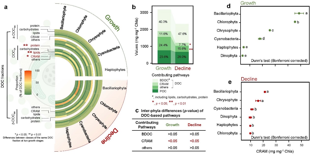 图2. 六个典型藻门(蓝藻门、绿藻门、硅藻门、金藻门、甲藻门和定鞭藻门)类群在生长期与衰亡期下,不同碳馏分(胞内DOC,胞外结合态DOC及胞外溶解态DOC)中不同碳组分的相对占比