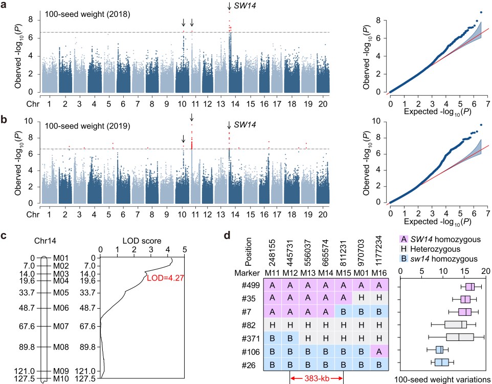 中国科学院华南植物园侯兴亮团队研究通过全基因组关联分析(GWAS)及QTL定位,在14号染色体上鉴定出一个与百粒重显著相关的稳定信号区间,并确定了一个调控大豆百粒重及品质的关键基因SW14。进一步研究发现,SW14与植物种子发育核心调控因子Leafy Cotyledon1(LEC1)在大豆中的同源基因GmLEC1a/b发生互作,抑制了GmLEC1在种子发育过程中介导的转录激活功能。进一步分析显示,优良等位基因SW14H3在大豆驯化过程中经历了人工选择,并展现出提高大豆产量的应用潜力。