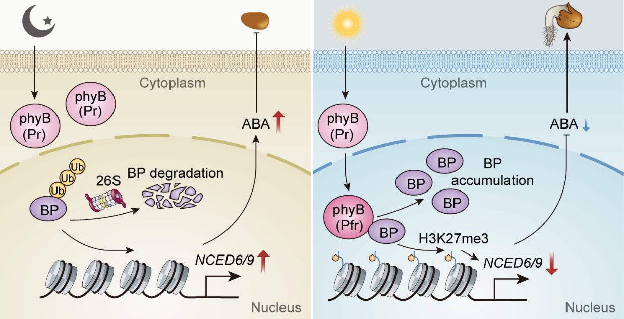 萌发是种子植物生命周期的起点,其精准调控对选择适宜的萌发条件至关重要。在多种环境因子中,光作为关键调控因素之一,被一系列光受体感知,包括光敏色素(phytochromes)、隐花色素(cryptochromes)、向光素(phototropins)和UVR8。其中,光敏色素作为红光/远红光受体,在光诱导的种子萌发中起核心作用,尤以phyB最为重要。红光激活phyB以启动萌发,而远红光则通过使其失活从而抑制萌发。在植物激素方面,脱落酸(ABA)和赤霉素(GA)分别作为负向和正向调节因子参与萌发调控。phyB介导的光信号通路依赖于与ABA和GA信号的协同互作。然而,长期以来,“光–phyB–ABA”途径中的核心调控因子及其分子机制仍不明确。