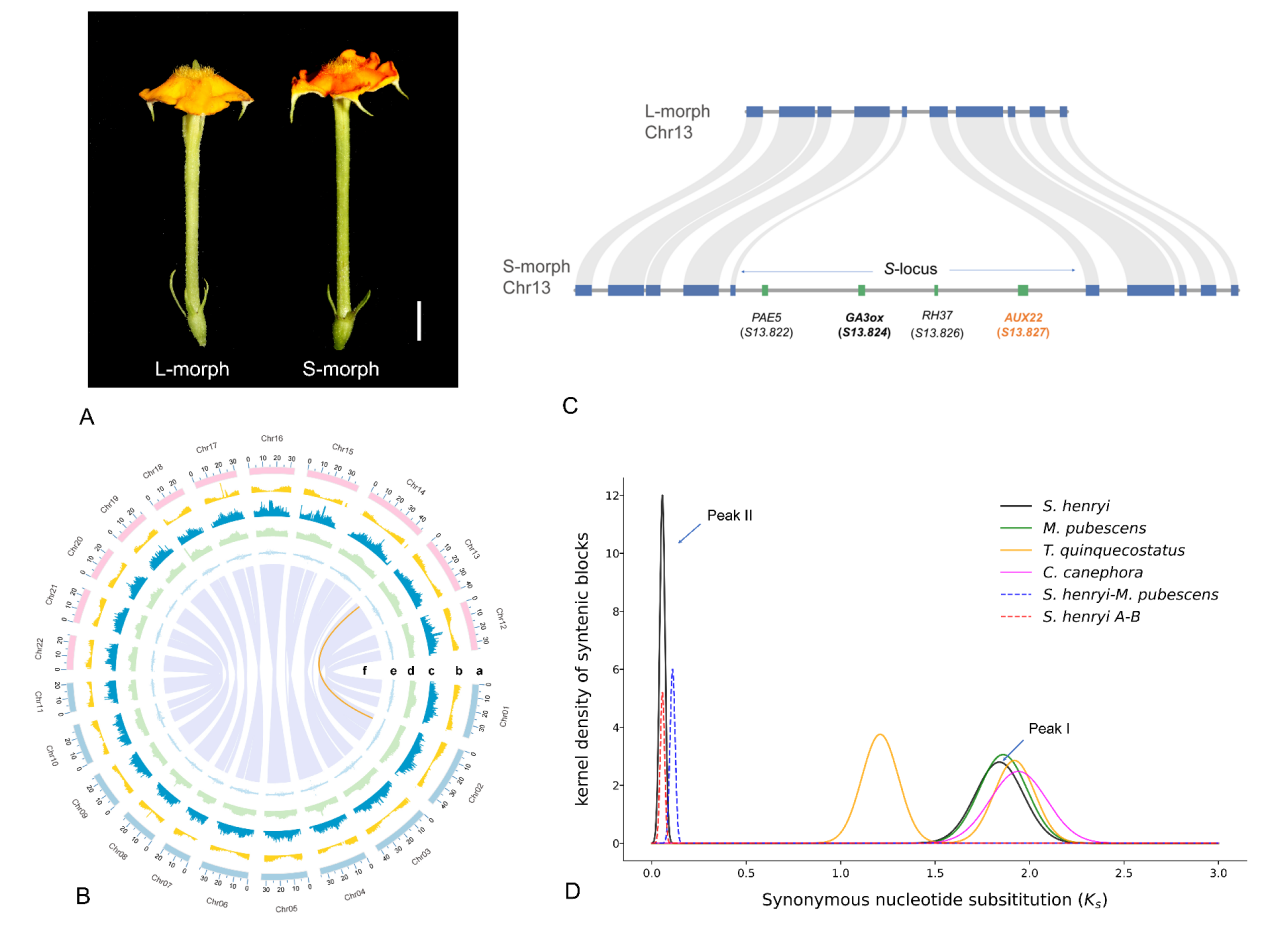 图. A. 裂果金花(Schizomussaenda henryi)长柱型花(L-morph)与短柱型花(S-morph);B. 短柱型基因组Circos图;C. 半合子位点基因结构示意图;D. 裂果金花与近缘物种旁系同源基因的Ks分布分析。