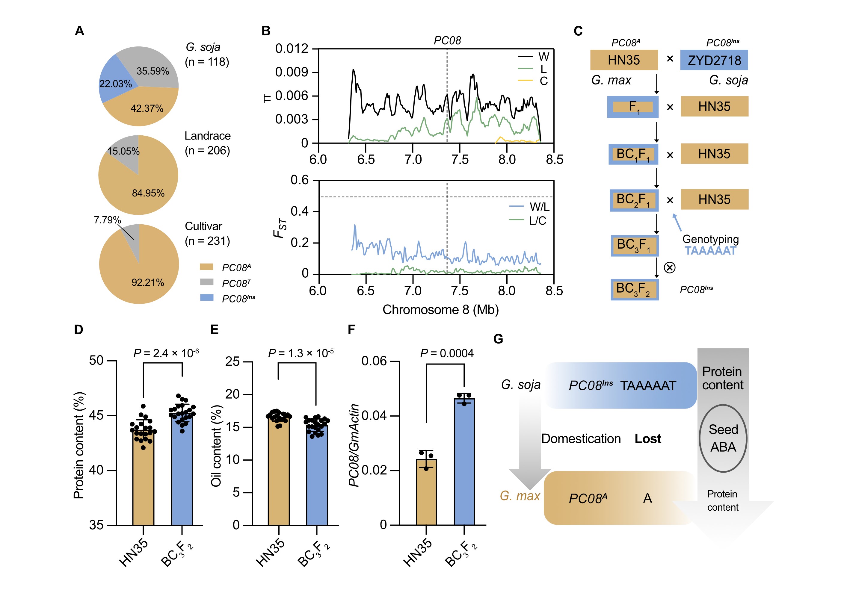 图. 大豆驯化中遗失的PC08等位基因提高种子蛋白含量