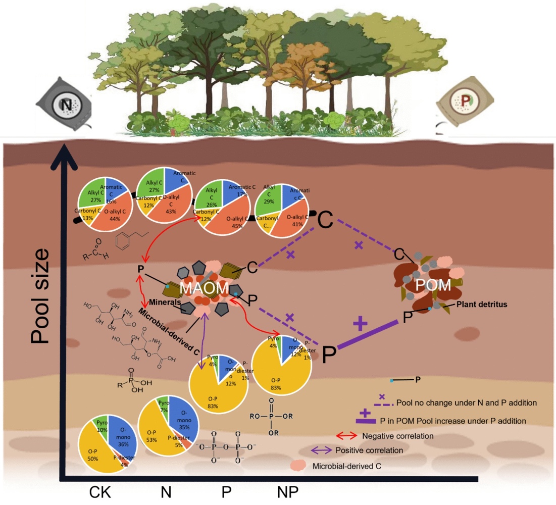 研究团队依托中国科学院小良热带海岸生态系统研究站的长期土壤氮磷添加实验平台(始建于2009年),综合运用固体¹³C核磁共振、液体³¹P核磁共振光谱以及土壤有机碳分级等技术,系统解析了热带森林土壤中颗粒态有机质(POM)与矿物结合态有机质(MAOM)两大功能碳库中碳、磷含量及其化学形态对养分输入的响应。其中,POM主要来源于植物残体,周转速率较快;MAOM则以微生物转化产物为主,通过与矿物结合实现长期稳定固存,二者共同调控土壤碳的持久性。