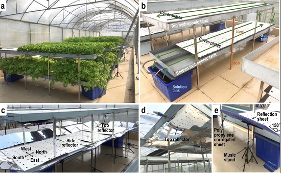 从2012年开始,中科院华南植物园分子生物分析及遗传改良研究中心苏韵琳博士等在区永祥研究员的指导下展开了对楼顶农业的研究,并在2016年发表了题为“Rooftop production of leafy vegetables can be profitable and less contaminated than farm-grown vegetables”(Liu et al., 2016 Agronomy for Sustainable Development 36: 41)的论文,说明了在楼顶生产水培蔬菜的优点以及它在广州实施的可行性。然而,当时的研究所采用的生产模式并不能带来较大的利润,可能难以吸引投资者的兴趣。因此,该团队对其他的种植策略进行了探索,希望通过提高产量以增加经济收益。我园的苏韵琳工程师等人设计了带有反光板的双层水培种植装置。在这种装置中,舍弃了对人工光源的使用,利用节能低成本的方法,将阳光通过反射板照射到底层,促进底层作物的生长(图1)。使用这种装置并结合适当的栽培策略,能有效地增加楼顶蔬菜的产量,提高楼顶农业的经济效益。据估算,若以该方式进行生产,经营150 m2的楼顶蔬菜大棚,将可获得接近广州人均收入的月利润,而且,如果把广州的所有楼顶面积都可用于蔬菜栽培,其总产量将能满足广州人口对蔬菜的基本需求。该研究结果有望能吸引更多人对都市农业的关注,以推动这项有利于人类可持续发展的事业的发展。