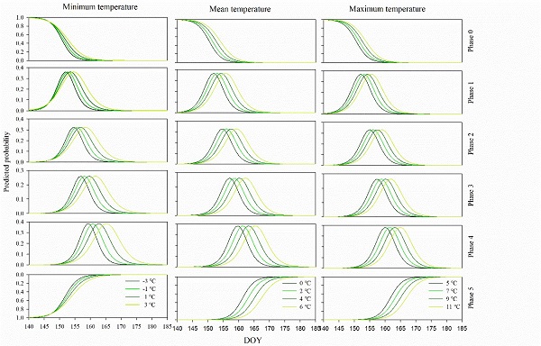 图1.根据四月份最低温度,平均温度和最高温度分别预测来自不同种源地糖枫树的发芽时间。