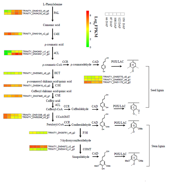 为了进一步探索兜兰种皮中非甲基化木质素的合成通路,科研人员对不同发育程度下杏黄兜兰的种子进行了转录组分析。KEGG富集分析表明,种子成熟过程中,苯丙烷生物合成和苯丙氨酸代谢相关的大量基因被差异表达。PAL,4CL,HCT和CSE上调表达与C型和H型木质素积累有关。 CCoAOMT,F5H和COMT的表达维持在低水平或下调以抑制G型和S型木质素的积累(见图2)。