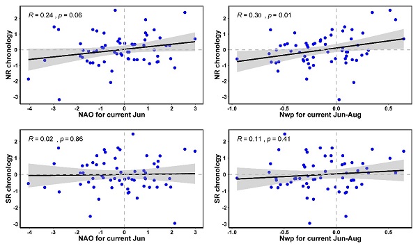 图. 当年6月NAO、6-8月Nwp与区域年表的相关