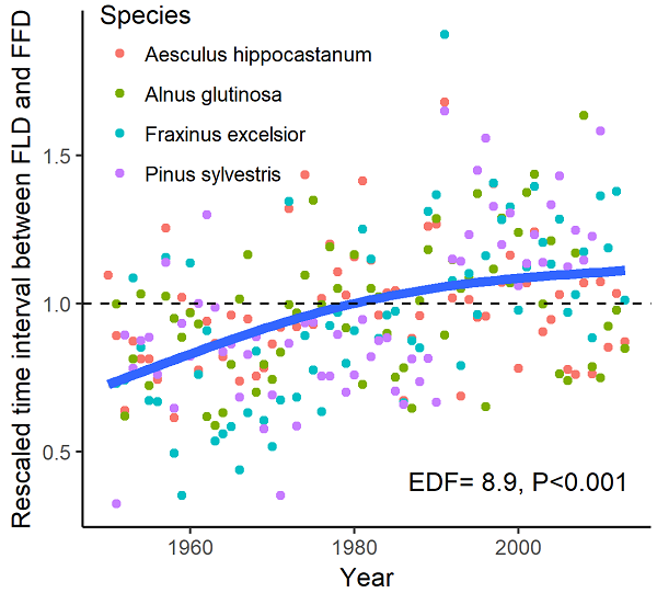 图. 春季展叶和开花两个物候期的时间间隔增大。