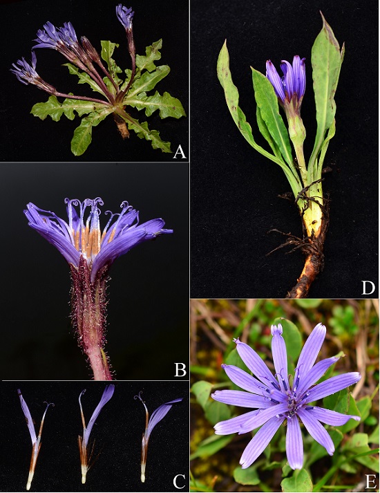 图1. 李恒菊属:李恒菊Lihengia amoena (A, B, C)和矮小李恒菊L. gombalana (D, E)。