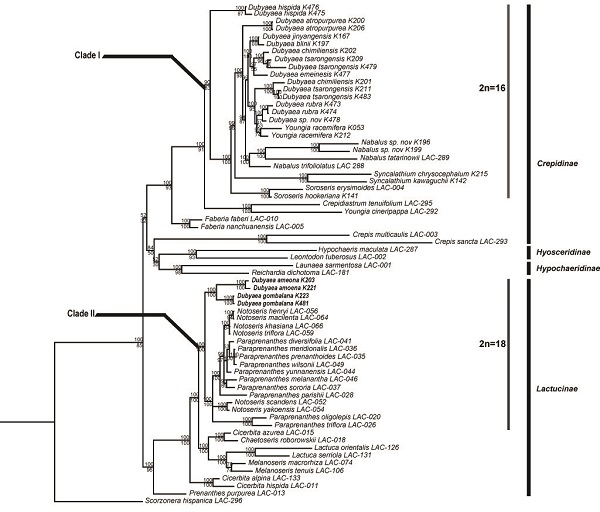 菊科是世界上植物类群中最大的科之一,超过3万种,同时也是我国植物最大的科,拥有2400余种。厚喙菊属(Dubyaea)是菊科菊苣族还阳参亚族( subtribe Crepidinae)的一个具有大约15种的属,全部种类分布于泛喜玛拉雅地区及其邻近地区。Stebbins曾认为厚喙菊属具有菊苣族一些广泛分布的属的祖先类群。