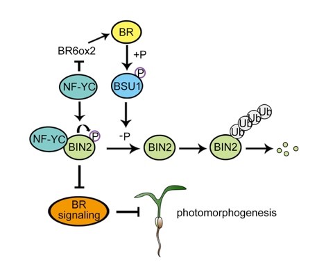 中科院华南植物园农业及生物技术研究中心博士生张文斌在侯兴亮研究员的指导下,通过对拟南芥核因子C亚基蛋白 (NUCLEAR FACTOR-Y Subunit C,NF-YC) 突变体的研究发现,光照条件下,NF-YC1/3/4/9基因是BR途径调控下胚轴伸长的重要抑制基因。NF-YC可直接负调控BR合成基因BR6ox2的表达,抑制BR合成;有趣的是,在NF-YC1/3/4/9功能缺失突变体 (nf-ycQ) 幼苗中,BR信号显著增强且不依赖于BR的合成,导致光下下胚轴伸长;进一步分析证实NF-YCs通过与BR信号途径的负调控因子BIN2互作,增强BIN2 Tyr200位点的自磷酸化作用,从而促进BIN2蛋白稳定性和激酶活性,最终抑制BR信号途径。当植物幼苗处于黑暗条件下,上述调控过程则不会发生。