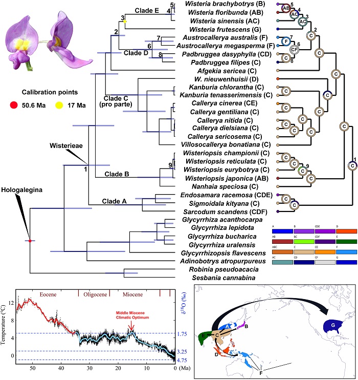 图2. 紫藤族的时空演化。左(树):分化时间分析;右(树):祖先分布区重建;左上(花):耀花豆的花;左下(曲线图):第三纪全球气温变化;右下(地图):紫藤族的分布区及迁移路线。
