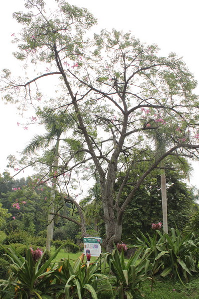 白露过后,空气中弥漫着丝丝秋意。当你走进木本花卉区便会发现一颗高大的树上开满艳丽的花朵,乍一看,很容易让人以为是木棉树。本应在春季开花的木棉树,居然在秋天开花了?原来这是与木棉花同科不同属的美丽异木棉。两者都是木棉科落叶大乔木,不同的是美丽异木棉花期为秋冬季,而木棉是春天开花。美丽异木棉开花时满树鲜艳的花朵,绚丽耀目,异常美丽,故别称美人树。美丽异木棉原产南美洲,华南植物园于1976年从美国洛杉矶引种并扩大繁殖。