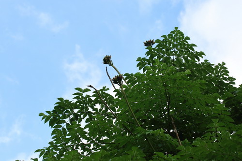 木蝴蝶(Oroxylum indicum)是紫葳科木蝴蝶属小乔木,树皮灰褐色,大型奇数羽状复叶,紫红色硕大的花朵,肉质厚实的花冠,檐部下唇3裂,上唇2裂,裂片微反折呈淡黄色。木蝴蝶三四层楼那么高的枝顶,骄傲地挺立着总状聚伞花序,远远就能望见,我曾无数次仰望树梢的风景,紫红色花苞聚在一起,像画笔一样把天空描摹成心中的模样,然而却难寻觅花的踪影,只有地上的落花默默的诉说着它的节律。