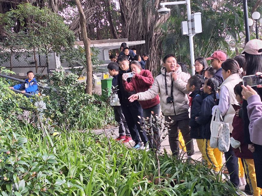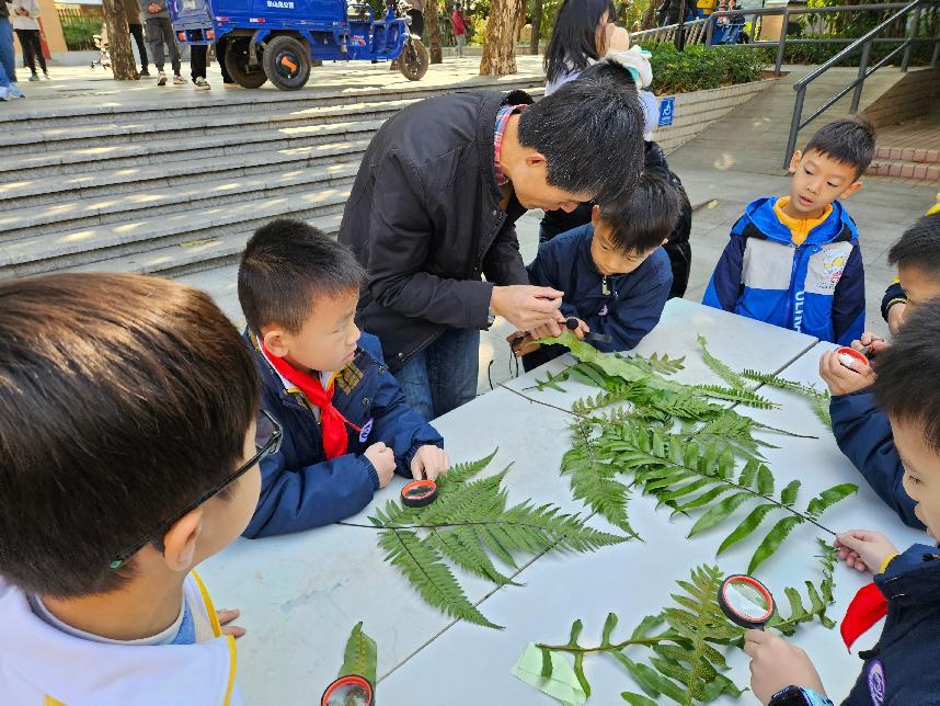 活动分科普知识讲堂、植物压花DIY及户外植物认知三个模块,为青少年带来了充满乐趣又涨知识的科普实践体验。在科普讲堂上,中国科学院华南植物园研究生郭永甲与孩子们探讨了“未来城市的绿色——立体绿化”在改善城市人居环境方面的重要作用和实际应用,让青少年对立体绿化有了更多的认识和了解。在标本制作和压花DIY环节,刘海林博士带孩子们用放大镜领略蕨类植物独特的繁殖方式,实操演示植物压花制作技巧,激发了孩子们的“自然艺术灵感”,体会创造的乐趣,感受植物压花艺术的魅力。在湖心岛植物引种区,中国科学院华南植物园邓双文博士不仅向师生及家长们生动讲述了每一种珍稀濒危重点保护植物的独特故事,还介绍了公园内丰富多彩的观赏和食药用植物,让大家更深刻理解了植物与我们日常生活和健康的紧密联系,提高了大家的生态保护意识。
