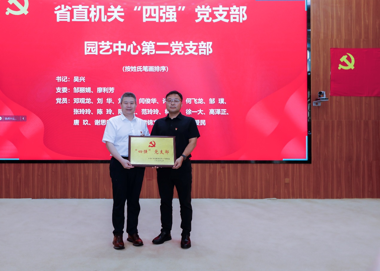 闫俊华为园艺中心第二党支部颁发“省直机关‘四强’党支部”荣誉奖牌