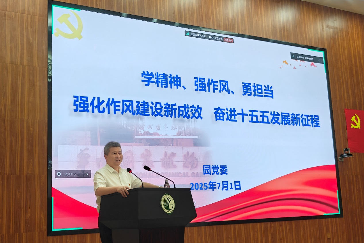 会上,闫俊华代表党委作题为《学精神、强作风、勇担当 强化作风建设新成效 奋进十五五发展新征程》的专题党课报告。报告总结了华南植物园在过去一年里的党建工作进展与成效,介绍了深入贯彻中央八项规定精神学习教育工作开展情况,查摆问题及整改进展、工作成效,传达了推动深入贯彻中央八项规定精神学习教育走深走实的通知要求,并对全体党员在担当作为、锐意进取、抢占科技制高点等方面提出了要求。他强调,新时代呼唤新担当,新征程呼唤新作为,党员领导干部要自觉涵养忠诚、干净、担当的政治本色,以“功成不必在我”的精神境界和“功成必定有我”的历史担当,勇挑重担、勇克难关、勇斗风险,努力作出无愧于时代、无愧于人民、无愧于历史的业绩。
